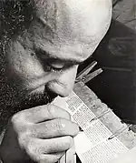 Workshop for making tefillin, ​​with rods for scrolls on racks against the wall; sofers precisely write four biblical passages on parchment for placing in each box (Jerusalem, 1964)