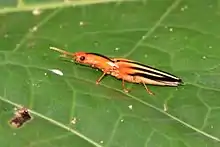 Semiotus distinctus can reach a length of 28–48 millimetres (1.1–1.9 in). Basic colour of the body varies from reddish-yellow to ferrugineous. Pronotum shows a single longitudinal median dark streak and deep scattered punctures, while elytra have two stripes and poorly impressed striae.
