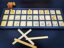 Senet or senat (Ancient Egyptian: ππππ , romanized: znt, lit.β'passing'; cf. Coptic β²₯β²β²β² /sinΙ/, 'passing, afternoon') is a board game from ancient Egypt that consists of ten or more pawns on a 30-square playing board.[1] The earliest representation of senet is dated to c. 2620 BCE from the Mastaba of Hesy-Re,[2] while similar boards and hieroglyphic signs are found even earlier, including in the Levant in the Early Bronze Age II period.[3][4] Even though the game has a 2,000-year history in Egypt, there appears to be very little variation in terms of key components.[1][5] This can be determined by studying the various senet boards that have been found by archaeologists, as well depictions of senet being played throughout Egyptian history on places like tomb walls and papyrus scrolls. However, the game fell out of use following the Roman period,[2] and its original rules are the subject of conjecture.