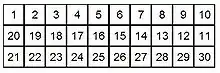 The senet board itself was usually constructed out of wood, ivory, faience or some combination of these materials, and the layout of the board was a grid of 30 squares, arranged in three rows of ten.[21] A complete senet game set would have contained a distinct set of pawns for each of the two players. At least by the New Kingdom, these pieces were in the form of hounds or dog-headed figurines.[22] Through most of the game's 2,000-year history, the senet boards themselves would indicate the direction of play, usually from the top left corner and indicated by the decorations on the spaces. The last five squares were often the most decorated on the board.[23][20] The decorations on the last five squares were unique, usually having a mark related to goodness or an aquatic reference on them.[23]