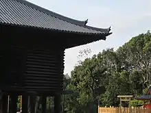 The building is in the Azekura Zukuri log-cabin style, with a floor raised to about 2.5 m takayuka-shiki (高床式).[5] This is an architectural style that was mainly used for the construction of granaries and storehouses. Some distinctive features of this building style are the triangular, wooden beams that come together in the corners, as well as the fact that it was assembled without using any bolts nor nails. This could be slightly surprising for its height of 14 m, width of 33 m and depth of about 9.3 m.[5] However, it was a logical and smart step. As a result of assembling the storehouse without bolts or nails, the structure became very flexible and able to withstand earthquakes, a phenomenon of nature with which Japan was already well acquainted during the Nara period. The Shōsō-in is also the only building to survive the Siege of Nara in the Heian period.[6] The exact construction date is unclear, but construction works probably started soon after the empress's bequest in AD 756 and definitely were finished before AD 759, when the bequest items storage lists were complete.