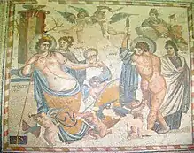 A museum located in the city exhibits some beautiful examples of Roman mosaics.[6] The especially rich iconography of the figurative mosaic on the theme, The Glory of the Earth, discovered in 1952 in the so-called "Maison Aoua", is conserved today in the museum of Damascus and has proved a rich resource for iconographers.[7]