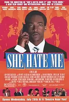 She Hate Me is a 2004 American independent comedy drama film directed by Spike Lee and starring Anthony Mackie, Kerry Washington, Ellen Barkin, Monica Bellucci, Brian Dennehy, Woody Harrelson, Bai Ling, and John Turturro. The film touches on a variety of themes such as corporate greed, race, sexuality, and politics. As with many of Lee's films, the film garnered controversy. Unlike many prior works, Spike Lee does not have an acting credit in this film.