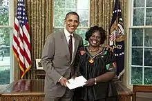 President Barack Obama welcomes Ambassador Sheila Z. Siwela of the Republic of Zambia to the White House on June 28, 2010, during the credentials ceremony for newly appointed ambassadors to Washington, D.C. [White House photo]