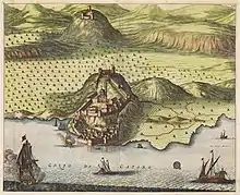 In June Barbarossa sent 30 galleys to block the entrance of the Gulf of Cattaro.[21] The vessels reached Castelnuovo on 12 June and disembarked a thousand soldiers with the aim of finding water and capturing Spanish soldiers or local civilians to gain information.[21] Once the Spanish were warned of their enemy's presence, Sarmiento dispatched three companies under Captain Machín de Munguía and the cavalry under Lázaro de Corón to attack them before lunchtime.[21] After a fierce fight the Ottoman landing party was forced to re-embark, although it returned in the afternoon. Then it was beaten by Francisco de Sarmiento in person, who was waiting for a new attempt together with Captains Álvaro de Mendoza, Olivera, and Juan Vizcaíno, and 600 soldiers. Three hundred Ottomans were killed during the battle, and another 30 captured.[23] The remainder escaped to their ships.[23]