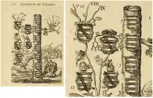 - ↑ Recueil de plusieurs pièces et figures d'armoiries obmises par les autheurs qui ont escrit jusques icy de cette science, blasonnées par le sieur Vulson de La Colombière,... suivant l'art des anciens roys d'armes, avec un discours des principes et fondemens du blason, et une nouvelle méthode de cognoistre les métaux et couleurs sur la taille-douce. Paris, 1639.
