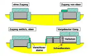 Initial progress - in terms of multiple use - was achieved by the creation of an entrance. In examples that were still dug into the ground the entrance was (in Denmark and Mecklenburg-Western Pomerania) initially made through the roof - as, for example, at Barkvieren. By dividing the ceiling into a large stone and a stone that could be lifted by hand, access from above was enabled. This variant, however, is not very widespread.