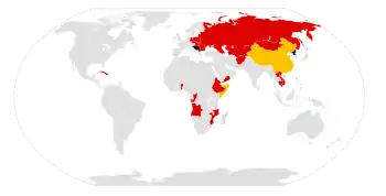 The Communist bloc: pro-Soviet (red), pro-Chinese (yellow), the non-aligned (black) North Korea and Yugoslavia.