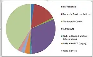 This was the most detailed parish-level occupation data ever published by the census as it included information on the precise occupations of the workers. In 1831 the information from the first three censuses was a three-way categorisation of families. A more detailed categorisation was produced although it only was limited to males aged 20 and over, although it does include numbers if male and female servants under 20. The census divides 63 males into nine categories; in 1831, 23 males worked as Agricultural Labourers which was the highest employed occupation from the census. 13 males were employed in Retail and Handicrafts followed closely with Manufacturing employing 10 males. In Slawston there are not any workers in the Capitalists, Professionals or Non-Agricultural Labourers categories but 3 other males were employed but there occupation is classed as unknown.[7] In the 1881 census data it gives information on the occupational orders in Slawston. Although in the 1881 census there are more people employed in each category there was a lower number of people employed in total. In 1881 Agriculture still had the highest number of employees with 26 men working in that category. Across the nine other categories, one to two males were employed in each category. For females, there were none working in Agriculture, Transport and communications, House, furniture and Decorations and dress but 34 females worked in an Unknown occupation, many of these categories combine 'Worker and Dealers' in different marketable items so it is hard to distinguish workers in manufacturing and services. In Slawston in 1881 there were two female professionals and 11 females working in Service or Offices which is a significant difference from males in Slawston.[8]