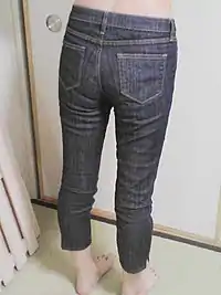 In the 2010s, several religious fundamentalist governments, especially radical Islamists, disapproved of tight trousers. In Saudi Arabia, the police were reportedly instructed to arrest teenagers who dress this way because the tight jeans are seen as un-Islamic and, when worn by men, a sign of homosexuality.[34] In the Gaza strip, Palestinian youths caught wearing skinny jeans have been arrested and beaten by the Hamas police.[35] Incidents of wearers being imprisoned or fined have been reported in places including Sudan[36] and in territories that were controlled by ISIL in 2015.[37] In Israel, a number of Rabbis signed a decree prohibiting devout Jewish men from wearing tight pants.[38][39]