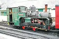 Until 1998 the diesels were an overall mid-green colour. It was decided that the warning colour on the coupling section would be striped red and white, with the crank axles an overall red colour. The diesels' colouring was later changed: Yeti, for example, adopted a red livery, and George a purple one. The warning colours also changed several times until around 2004, when all the diesels again received a green livery, with yellow and black warning colours. Painted green from 2000, they were painted black from 2013.[37]