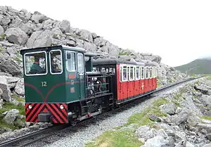 The Snowdon Mountain Railway (SMR; Welsh: Rheilffordd yr Wyddfa) is a narrow gauge rack and pinion mountain railway in Gwynedd, north-west Wales. It is a tourist railway that travels for 4.7 miles (7.6 km) from Llanberis to the summit of Snowdon, the highest peak in Wales.[4]