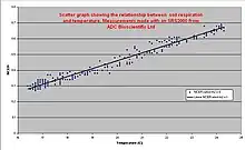When using linear regression, multiple data points are graphed and the points can be fitted with a linear regression equation, which will provide a slope. This slope can provide the rate of soil respiration with the equation , where F is the rate of soil respiration, b is the slope, V is the volume of the chamber and A is the surface area of the soil covered by the chamber.[17] It is important that the measurement is not allowed to run over a longer period of time as the increase in CO2 concentration in the chamber will also increase the concentration of CO2 in the porous top layer of the soil profile. This increase in concentration will cause an underestimation of soil respiration rate due to the additional CO2 being stored within the soil.[18]