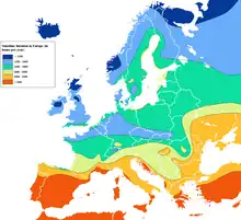 Turkey has a sunny climate, ideal for producing solar power. There are about 2600 hours of sunshine each year (about 7 hours a day),[16][17] almost twice that of Germany, yet Germany has five times as much solar capacity.[18] Turkey's average annual solar irradiance is over 1 million terrawatt-hours,[1] that is about 1500 kW·h/(m2·yr) or over 4 kW·h/(m2·d).[16][1] Covering less than 5% of the country's land area with solar panels would provide all the energy needed.[19] Solar power may also be preferable to other renewable energy sources such as wind power and hydroelectricity because wind speed and rainfall can be low in summer, which is when demand peaks due to air conditioning.[20]