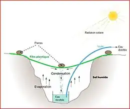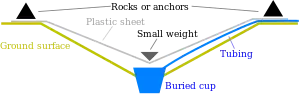 A solar still can be constructed with two–four stones, plastic film or transparent glass, a central weight to make the funnel and a container for the condensate.[3] Better materials improve efficiency. A single sheet of plastic can replace the branches and leaves. Greater efficiency arises because the plastic is waterproof, preventing water vapour from escaping. The sheet is attached to the ground on all sides with stones or earth. Weighting the centre of the sheet forms the funnel. Condensate runs down it into the receptacle. One study of pit distillation found that angling the lid at 30 degrees angle captured the most water. The optimal water depth was about 25 millimetres (1 in).[4]