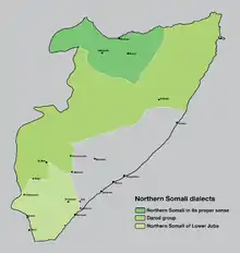 Somali linguistic varieties are broadly divided into three main groups: Northern, Benadir and Maay.[26] Northern Somali (or Nsom[27]) forms the basis for Standard Somali.[26] It is spoken by more than 85% of the entire Somali population, with its speech area stretching from Djibouti, Somali Region of Ethiopia, Northern Frontier District to most parts of Somalia[28] This widespread modern distribution is a result of a long series of southward population movements over the past ten centuries from the Gulf of Aden littoral.[29] Lamberti subdivides Northern Somali into three dialects: Northern Somali proper (spoken in the northwest; he describes this dialect as Northern Somali in the proper sense), the Darod group (spoken in the northeast and along the eastern Ethiopia frontier; greatest number of speakers overall), and the Lower Juba group (spoken by northern Somali settlers in the southern riverine areas).[27]