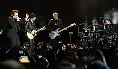 U2 embarked on the Innocence + Experience Tour in May 2015,[17] visiting arenas in North America and Europe from May through December.[18] The band originally began the tour with the intent to stage it in two phases, one with material primarily taken from Songs of Innocence and one with material that would eventually be from Songs of Experience.[19] The group structured their concerts around a loose autobiographical narrative of "innocence" passing into "experience", with a fixed set of songs for the first half of each show and a varying second half, separated by an intermission—a first for U2 concerts.[20] The stage spanned the length of the venue floor and comprised three sections: a rectangular main stage, a smaller circular B-stage, and a connecting walkway.[20] The centerpiece of the set was a 96-foot-long (29 m) double-sided video screen that featured an interior catwalk, allowing the band members to perform amidst the video projections.[21][22] U2's sound system was moved to the venue ceilings and arranged in an oval array, in hopes of improving acoustics by evenly distributing sound throughout the arena.[20] In total, the tour grossed US$152.2 million from 1.29 million tickets sold.[23]