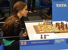 Sopiko Guramishvili (Georgian: სოფიკო გურამიშვილი; born 1 January 1991) is a Georgian and Dutch chess player, author, and commentator who holds the titles of International Master (IM) and Woman Grandmaster (WGM). Having represented Georgia for the bulk of her playing career, she has been an under-16 girls' World Youth Champion and an under-18 girls' Georgian national champion. She has a peak FIDE rating of 2441 and has been ranked as high as No. 42 in the world among women.