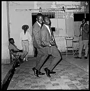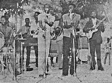 In the 1960s, a new wave of youth bands, often referred to as yéyé, garnered attention, overshadowing established figures like Franco Luambo and Tabu Ley Rochereau with their rhythms and dances. They elevated the rumba's tempo, elongated the seben, and coined a new name: secousse, from the French secouer, meaning "to shake."[16] Artists began incorporating faster rhythms, prominent guitar improvisation, and more distinct African elements. The drummer shifts to the high-energy beat, where the clave rhythm shifts to the snare drum, singers engage in rhythmic chanting (animation), and lead guitars take center stage. Franco Luambo, along with his band TPOK Jazz, is credited with pioneering the genre. He is also conceded for revolutionizing the genre's themes by infusing momentous social and political issues into the lyrics, transforming the music into a platform for social consciousness.[18][2][19][20] Tabu Ley Rochereau and Dr. Nico Kasanda formed African Fiesta and transformed their music further by fusing Congolese folk music with soul music, as well as Caribbean and Latin beats and instrumentation. They were joined by Papa Wemba and Sam Mangwana, and classics like "Afrika Mokili Mobimba" propelled them as one of Africa's most prominent bands.[21][22][23][24] The soukous scene blossomed due to limited employment prospects for youths in Zaire, with pursuing a career as a musician in Kinshasa's burgeoning soukous scene becoming one of the few available paths.[13]