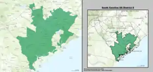 South Carolina's 6th congressional district is in central and eastern South Carolina. It includes all of Allendale, Bamberg, Calhoun, Clarendon, Hampton, and Williamsburg counties and parts of Charleston, Colleton, Dorchester, Florence, Jasper, Orangeburg, Richland and Sumter counties. With a Cook Partisan Voting Index rating of D+14, it is the only Democratic district in South Carolina.[2]