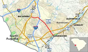 SC 126 is a suburban highway that travels 4.2 miles (6.8 km) from U.S. Route 25 (US 25)/SC 121 in Belvedere to SC 421 in Clearwater. In both Belvedere and North Augusta, SC 126 is a four-lane road with median; in Clearwater it only has two lanes. The entire highway has few commercial entities, mainly functioning to connect neighborhoods in the area. It also has intermediate junctions with Interstate 520 (I-520) and US 1/US 78.[2]