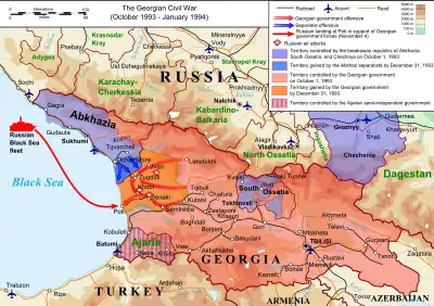 In late 1991, dissent was mounting against Gamsakhurdia in Georgia due to his intolerance of critics and attempts to concentrate political power.[60] On 22 December 1991, after a coup d'état, Gamsakhurdia and his supporters were besieged by the opposition, which was backed by the national guard, in several government buildings in Tbilisi. The ensuing heavy fighting resulted in over 200 casualties and left the center of the Georgian capital in ruins. On 6 January, Gamsakhurdia and several of his supporters fled the city for exile. Afterwards, the Georgian military council, an interim government, was formed by a triumvirate of Jaba Ioseliani, Tengiz Kitovani and Tengiz Sigua, and, in March 1992, they invited Eduard Shevardnadze, a former Soviet minister, to come to Georgia to assume control of the Georgian State Council.[68][69]