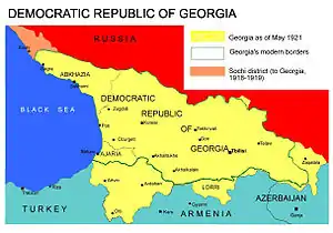 Following the Russian revolution,[39] the area of modern South Ossetia became part of the Democratic Republic of Georgia.[40] In 1918, conflict began between the landless Ossetian peasants living in Shida Kartli (Interior Georgia), who were influenced by Bolshevism and demanded ownership of the lands they worked, and the Menshevik government backed ethnic Georgian aristocrats, who were legal owners. Although the Ossetians were initially discontented with the economic policies of the central government, the tension soon transformed into ethnic conflict.[40] The first Ossetian rebellion began in February 1918, when three Georgian princes were killed and their land was seized by the Ossetians. The central government of Tiflis retaliated by sending the National Guard to the area. However, the Georgian unit retreated after they had engaged the Ossetians.[41] Ossetian rebels then proceeded to occupy the town of Tskhinvali and began attacking the ethnic Georgian civilian population. During uprisings in 1919 and 1920, the Ossetians were covertly supported by Soviet Russia, but even so, were defeated.[40] According to allegations made by Ossetian sources, the crushing of the 1920 uprising caused the death of 5,000 Ossetians, while ensuing hunger and epidemics were the causes of death of more than 13,000 people.[42]