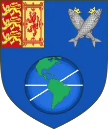 ![]() Arms of the South Sea Company: Azure, a globe whereon are represented the Straits of Magellan and Cape Horn all proper and in sinister chief point two herrings haurient in saltire argent crowned or, in a canton the united arms of Great Britain | |