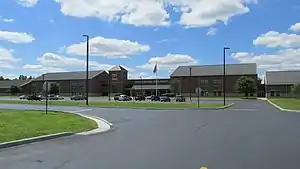 In October 1935, the district board decided on an expected 12-acre plot on Lancaster Road for the six-year Southeastern rural high school.[1] About a half year later, a new structure for the Southeastern rural high school was selected on April 10, 1936, on the Caldwell Farm at the corner of Higby Road and the Chesapeake & Ohio Railway.[2]