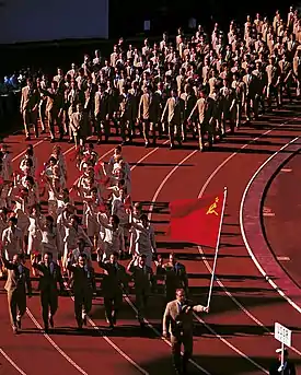 Following the Russian Revolution of November 1917 and the Russian Civil War (1917–1922), the Soviet Union did not participate in international sporting events on ideological grounds;[2] however, after World War II (1939–1945), dominating the Olympic Games came to be seen by Soviet officials and leaders as a useful method of promoting communism.[3] The Olympic Committee of the USSR was formed on April 21, 1951, and the IOC recognised the new body in its 45th session (May 7, 1951). In the same year, when the Soviet representative Konstantin Andrianov became an IOC member, the USSR officially joined the Olympic Movement.