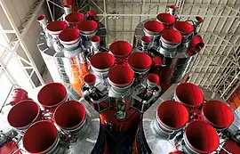 The first stage of Soyuz rockets consists of four identical conical liquid booster rockets, strapped to the second stage core. Each booster has a single rocket motor with four combustion chambers, two vernier combustion chambers, and one set of turbopumps.