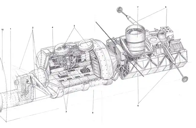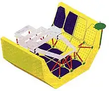Spacelab consisted of a variety of interchangeable components, with the major one being a crewed laboratory that could be flown in the Space Shuttle orbiter's bay and returned to Earth.[8] However, the habitable module did not have to be flown to conduct a Spacelab-type mission and there was a variety of pallets and other hardware supporting space research.[8] The habitable module expanded the volume for astronauts to work in a shirt-sleeve environment and had space for equipment racks and related support equipment.[8] When the habitable module was not used, some of the support equipment for the pallets could instead be housed in the smaller Igloo, a pressurized cylinder connected to the Space Shuttle orbiter crew area.[8]