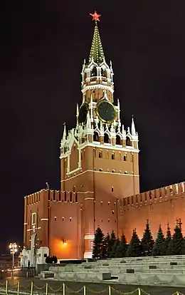 The Spasskaya Tower (Russian: Спасская башня, romanized: Spasskaya bashnya), also translated as the Saviour Tower, is the main tower on the eastern wall of the Moscow Kremlin which overlooks Red Square.