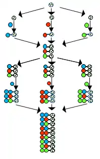 Flow diagram of the S&P synthesis. Circles: colored BBs, black and white support, divergent arrows: dividing into equal portions, vertical arrows: coupling; convergent arrows: mixing and homogenizing