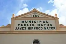The street facade gives the building substantial presence within the domestic streetscape. It presents a balanced arrangement of arched sash windows and doorways, with a simple parapet and pediment. On the latter is displayed the date 1886 and the inscription "Municipal Public Baths" and "James Hipwood Mayor". The facade is crowned with masonry urns and plaster floral motifs. The street entrance is covered by a corrugated iron awning on timber frame and brackets.[1]