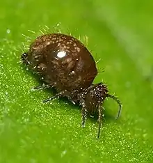 Springtails are well known as pests of some agricultural crops. Sminthurus viridis, the lucerne flea, has been shown to cause severe damage to agricultural crops,[67] and is considered as a pest in Australia.[68][69] Onychiuridae are also known to feed on tubers and to damage them to some extent.[70] However, by their capacity to carry spores of mycorrhizal fungi and mycorrhiza helper bacteria on their tegument, soil springtails play a positive role in the establishment of plant-fungal symbioses and thus are beneficial to agriculture.[71] They also contribute to controlling plant fungal diseases through their active consumption of mycelia and spores of damping-off and pathogenic fungi.[72][73] It has been suggested that they could be reared to be used for the control of pathogenic fungi in greenhouses and other indoor cultures.[74][75]
