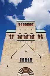 The cathedral church was built between 1010 and 1020 in the Romanesque style. It follows a symmetrical plan with two apses, that is characteristic of Ottonian Romanesque architecture in Old Saxony. The cathedral's treasures include world-famous artworks, bronze works from the time of Bishop Bernward, Bernward Doors and Bernward Column, as well as two of the four notable Romanesque wheel chandeliers: the Hezilo chandelier and the Azelin chandelier.