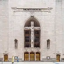 The current building's front facade features a crucifix titled "Christ of the Loop", designed by Latvian sculptor Arvid Strauss, executed by Chicago artist J. Watts. It is 18 feet (5.5 m) tall.[2][3]