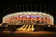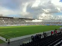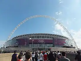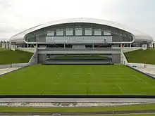 A stadium (pl.: stadiums or stadia)[1] is a place or venue for (mostly) outdoor sports, concerts, or other events and consists of a field or stage either partly or completely surrounded by a tiered structure designed to allow spectators to stand or sit and view the event.[2][3]