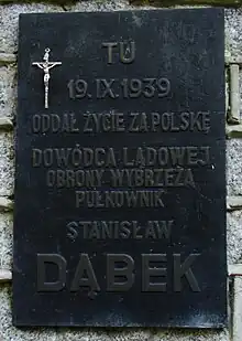 On the eve of World War II, on July 23, 1939, he was appointed commander of the Marine Brigade of National Defense and acting commander of the Land Coastal Defence. As a person of great diligence and great organizational inventiveness, he undertook active work on strengthening the defensive positions and strengthening the armaments of units subordinate to him. As a result of his activities, the number of Polish branches in the Gdynia region increased from 5,000 to up to 15-18 thousand people. The tasks set for LOW envisaged maintaining the foreground of Gdynia for 3 days, and then a 7-day defense of Kępa Oksywska as the last defense bastion. During the September campaign, Colonel Dąbek actively commanded all the land forces gathered around Gdynia by organizing offensive forays. On the night of September 1/2 and 3/4, he attacked the enemy in the Gdynia-Kolibki-Osowo area, removing his pressure from the south, and on September 6/7 and 7/8 he ordered an attack on the Nowy Dwór Wejherowski - Wejherowo axis. The counterattack of 3 battalions on the Zagórze - Reda axis was planned for September 12, aimed at pushing back the enemy forces to the north and separating their forces, ended in a fiasco due to errors in the implementation of the assigned tasks. In view of the overwhelming forces of the Wehrmacht and the cut-off of the Polish troops on the coast from the rest of the country, Dąbek decided to evacuate the forces remaining in his hands (9-10 thousand people) to Kępa Oksywska. In the evening of September 19, 1939, in the area of Babich Dołów, in the face of inevitable defeat, took his own life with a shot in the head, ordering the immediate cessation of the fight after his death. A modest funeral ceremony, after which the colonel was buried in a grave near the Quarantine Institution, was conducted by Fr. Cdr. Władysław Miegoń, the first chaplain of the Navy. On October 23, 1946, exhumations took place at the "Babi Dół cemetery", incl. col. Dąbka.[16][17] On the other hand, on October 30, 1946, the solemn funeral of the commander of the Land Defense of the Coast and his six comrades-in-arms took place.[18] On August 30, 1957, on the grave of Colonel Dąbek at the Cemetery of the Defenders of the Coast in Redłowo, a tombstone was unveiled with the words "I will show you how a Pole fights and dies".[19] A memorial plaque was unveiled in Babie Doły on September 19, 1974, to commemorate the place of the colonel's death. The colonel's wife, Irena Dąbek, participated in the ceremony. The plaque was made by the Naval Shipyard Foundry. This place is not accessible to the general public, as it is located in the 43rd Naval Aviation Base.