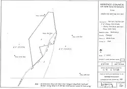 The property is situated at the end of a country lane and is approximately 46.5 acres of good arable grazing land. There is a large dam and a shed/garage with parking for two cars. It has 1.5 acres of mature gardens that follow European and Australian traditions with a mixture of exotic and native trees and shrubs. Within the garden with its outstanding rural outlooks, are an in-ground fishpond, gazebo, topiary, box (Buxus sp.) maze and a 15m analemmatic sundial. Tall forest red gums (Eucalyptus tereticornis) provide an imposing backdrop and there is considerable evidence of past aboriginal presence on the site.[5][1]