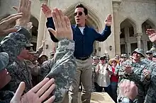 Colbert arrived in Baghdad, Iraq, on June 5, 2009, to film a week of shows called "Operation Iraqi Stephen: Going Commando" sponsored by the USO (United Service Organizations).[130] Colbert had a suit tailored for him in the Army Combat Uniform pattern.[131] During the first episode (which featured a cameo appearance from U.S. president Barack Obama), Colbert had his hair cropped in a military style to show his solidarity with the troops. One Army major said that "shaving of the hair is an amazing show of support" that was "very touching." USO Senior Vice President John Hanson said the shows are an important diversion for the troops.[132]