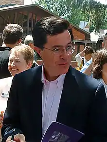 Since 2012, Colbert has collaborated with the Montclair Film Festival, of which his wife is a founder and current president of its board.[162][163] Every year since its foundation, Colbert has participated by hosting an annual fundraising event and leading Q&As and conversations with directors, writers, journalists, and actors such as: Jon Stewart, Rob Reiner, Steve Carell, J. J. Abrams, David Itzkoff, Ethan Hawke, Rachel Weisz, and Meryl Streep.[164][165] He is also part of the Montclair Film advisory board.[166]