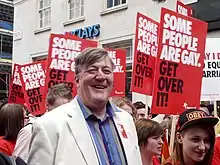Fry struggled to keep his homosexuality secret during his teenage years at public school, and by his own account did not engage in sexual activity for 16 years until the mid-1990s.[184] When asked when he first acknowledged his sexuality, Fry quipped: "I suppose it all began when I came out of the womb. I looked back up at my mother and thought to myself, 'That's the last time I'm going up one of those'."[185] Fry was in a 15-year relationship with Daniel Cohen that ended in 2010.[186] Fry was listed number 2 in 2016 and number 12 in 2017 on the Pride Power list.[187][188]