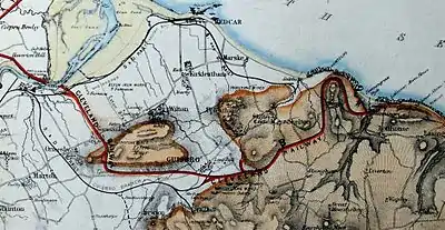 Henry Pease, a S&DR director and Quaker, visited his brother Joseph in mid-1859 at his house by the sea at Marske-by-the-Sea. Returning late for dinner, he explained he had walked to Saltburn, then a group of fisherman's cottages, where he had had a "sort of prophetic vision" of a town with gardens. With other S&DR directors he planned the town, with gardens and Zetland Hotel by the station, and bought a house at 5 Britannia Terrace, where he stayed for a few weeks every summer.[163] The extension opened in 1861, a station on the through line replacing the terminus at Redcar.[160][164]