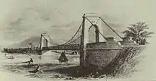 The Croft branch opened in October 1829.[78] Construction of the suspension bridge across the Tees started in July 1829, but was suspended in October after the Tees Navigation Company pointed out the S&DR had no permission to cross the Old Channel of the Tees. The S&DR prepared to return to Parliament but withdrew after a design for a drawbridge was agreed with the Navigation Company.[79] The line to Middlesbrough was laid with malleable iron rails weighing 33 lb/yd (16 kg/m), resting on oak blocks.[80] The suspension bridge had been designed to carry 150 tons, but the cast iron retaining plates split when it was tested with just 66 tons and loaded trains had to cross with the waggons split into groups of four linked by a 9-yard-long (8.2 m) chain.[81][82] For the opening ceremony on 27 December 1830, "Globe", a new locomotive designed by Hackworth for passenger trains, hauled people in carriages and waggons fitted with seats across the bridge to the staiths at Port Darlington, which had berths for six ships.[83] Stockton continued to be served by a station on the line to the quay until 1848, when it was replaced by a station on the Middlesbrough line on the other side of the Tees.[84] Before May 1829, Thomas Richardson had bought about 500 acres (200 ha) near Port Darlington, and with Joseph and Edward Pease and others he formed the Owners of the Middlesbrough Estate to develop it.[85][86] Middlesbrough had only a few houses before the coming of the railway,[87] but a year later had a population of over 2,000 and at the 2011 census had over 138,000 people.[88][89]