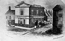 In 1830, the company opened new offices at the corner of Northgate and Union Street in Darlington.[90] Between 1831 and 1832 a second track was laid between Stockton and the foot of Brusselton Bank. Workshops were built at Shildon for the maintenance and construction of locomotives.[91] In 1830 approximately 50 horses shared the traffic with 19 locomotives, but travelled at different speeds, so to help regulate traffic horse-drawn trains were required to operate in groups of four or five. This had led to horses, startled by a passing locomotive and coming off their dandy cart, being run down by the following train. On one occasion a driver fell asleep in the dandy cart of the preceding train and his horse, no longer being led, came to a stop and was run down by a locomotive. The rule book stated that locomotive-hauled trains had precedence over horse-drawn trains, but some horse drivers refused to give way and on one occasion a locomotive had to follow a horse-drawn train for over 2 miles (3 km).[92][93] The committee decided in 1828 to replace horses with locomotives on the main line, starting with the coal trains, but there was resistance from some colliery owners. After the S&DR bought out the coach companies in August 1832, a mixed passenger and small goods service began between Stockton and Darlington on 7 September 1833, travelling at 12–14 miles per hour (19–23 km/h); locomotive-hauled services began to Shildon in December 1833 and to Middlesbrough on 7 April 1834.[94][95] The company had returned the five per cent dividend that had been promised by Edward Pease, and this had increased to eight per cent by the time he retired in 1832.[96] When the treasurer Jonathan Backhouse retired in 1833 to become a Quaker minister, he was replaced by Joseph Pease.[97]