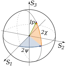 Here , and are the spherical coordinates of the three-dimensional vector of cartesian coordinates . is the total intensity of the beam, and is the degree of polarization, constrained by . The factor of two before represents the fact that any polarization ellipse is indistinguishable from one rotated by 180°, while the factor of two before indicates that an ellipse is indistinguishable from one with the semi-axis lengths swapped accompanied by a 90° rotation. The phase information of the polarized light is not recorded in the Stokes parameters. The four Stokes parameters are sometimes denoted I, Q, U and V, respectively.