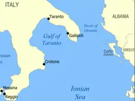 The Strait of Otranto (Albanian: Ngushtica e Otrantos; Italian: Canale d'Otranto) connects the Adriatic Sea with the Ionian Sea and separates Italy from Albania. Its width at Punta Palascìa, east of Salento is less than 72 km (45 miles; 39 nautical miles).[1] The strait is named after the Italian city of Otranto.