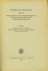 Studia evangelica is book containing a series of papers presented to the International Congress held at Christ Church (University of Oxford), Oxford, 1957. The Congress followed immediately on the annual gathering of the Studiorum Novi Testamenti Societas which had met at Birmingham. The full title is: Studia evangelica: papers presented to the International Congress on "The Four Gospels in 1957" held at Christ Church, Oxford, 1957. This was followed by six more volumes containing papers presented at subsequent congresses. the last being published in 1982. All were in the series "Texte und Untersuchungen zur Geschichte der altchristlichen Literatur"; Bd. 73, 87, 88, 102, 103, 112 & 126.